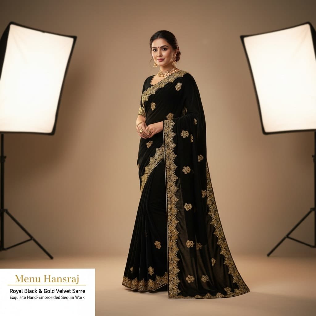 Luxury black velvet ethnic ensemble with rich gold embroidery. The outfit gives a royal, winter-wedding vibe with a strong statement look.